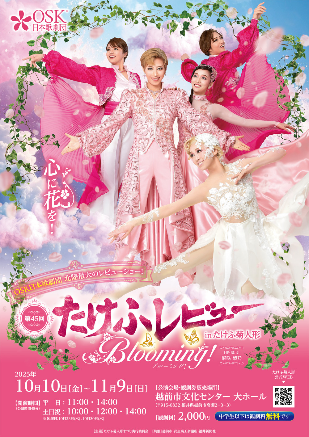 たけふレビュー45周年を祝し、「花」をモチーフとしたエネルギッシュでスタイリッシュなレビューショーをお届けします。季節の移り変わりを追いながら、それぞれのシーズンを連想させる曲に乗せてスピーディに場面を展開し、定番のラインダンス、昭和5年から歌い継ぐテーマソング「桜咲く国」も披露します。